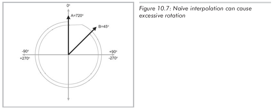 = 360 x 2,也就是0度。所以heading值只相差45度,但简单的插值会在错误的方向上绕将近两周。如图10.7所示: