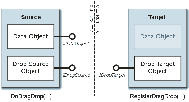 右边的方块表示拖放操作的目标,其创建一个COM对象(IDropTarget接口)。当鼠标被拖动过目标窗口时,OLE传递一个IDataObject接口到目标对象,这是源暴露给目标的数据对象。对象不能以任何方式得到一个副本,仅仅COM接口变为可用。当目标从数据对象提取数据时,OLE/COM运行时负责函数调用已经通过进程边界的数据传输。
