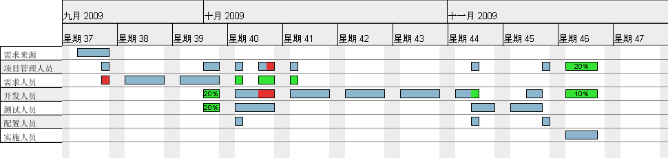 参与项目的主要角色有:项目管理人员/需求人员/研发人员/测试人员/配置人员/实施人员。他们分阶段进入项目,分阶段离开项目。下图为人力投入示例: