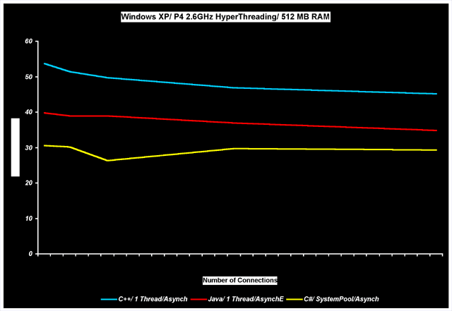 图1、2显示了以 bits/sec为单位的传输速度以及相应的连接数。这些图比较了以下三种方式实现的echo服务器:标准ACE Reactor实现(基于RedHat Linux9.0)、TProactor C++/Java实现(Microsoft Windows平台及RedHat v9.0), 以及C#实现。测试的时候,三种服务器使用相同的客户端疯狂地连接,不间断地发送固定大小的数据包。