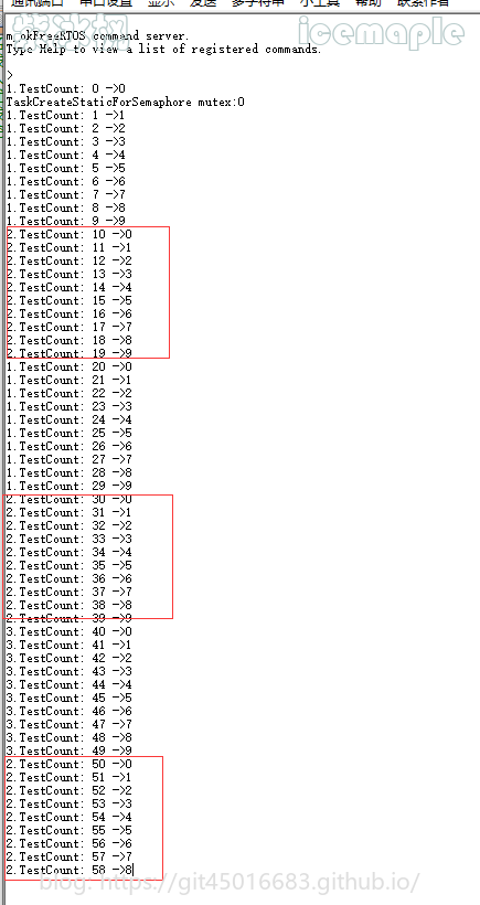 可以看到后面都是任务2的信息在输出,这是因为任务2的优先级最高,它释放了互斥量后,马上又获取到,其他两个任务饿死了……