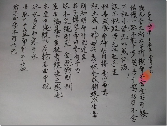 看到荀子劝学中的语句,很有感触, 遂抄写了一遍,以资鼓励.