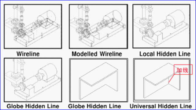 AVEVA Draft模块就是用来生成有比例投影图的程序,设备布置图、安装图等。有比例投影图的核心算法就是根据三维模型自动生成各种消隐方式的二维图形。在AVEVA Draft模块中就有下面几种消隐方式: