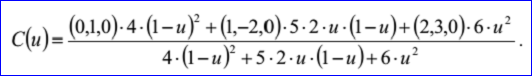 <3D curve record 6>定义了Bezier曲线。Bezier曲线数据包含有理标志r,曲线的次数m(degree m <= 25查看源代码可知OpenCascade可处理的B样条次数不超过25)和带权的控制点(weight poles)。当有理标志位r=0时,weight poles就是m+1个三维点:B0,B1...Bn;当有理标志位r=1时,weight poles就是带权的控制点B0 h0... Bm hm。Bi是三维点,hi是[0,m]正实数,即权因子。当有理标志位r=0时,即不是有理Bezier曲线时,hi=1。Bezier曲线参数方程如下所示: