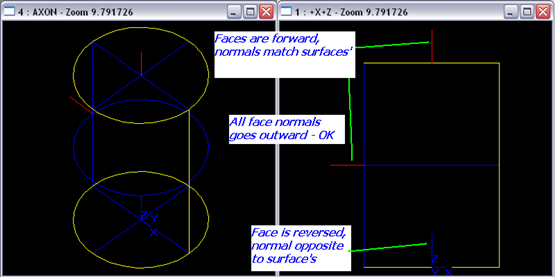 面的朝向表示面的法向与曲面法向之间的关系(Face orientation shows how face normal is aligned with its surface normal)。若面的朝向是TopAbs_FORWARD(向前),则面的法向与曲面的法向一致;若面的朝向是TopAbs_REVERSED(反向),则面的法向与曲面的法向相反。面的法向表示材质的位置,材料位于面的背面。在正确描述的实体中,所有面的法向都是向外的,如下图所示: