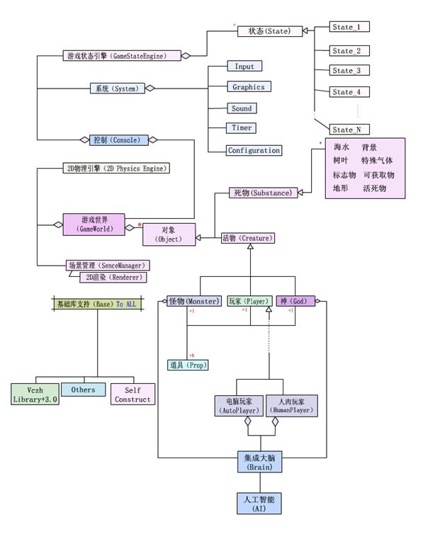 神是GWorld的内嵌类,在GWorld层次还不能加入神的意志(Consider方法),因为那是设计游戏逻辑阶段的可配置内容,所以所有随机事件和记录方式、影响审判的策略都没有形成,总不能用GWorld加入AI类的对象,因为AI不属于物理引擎范畴。于是GWorld::GDominator可以被游戏设计者自己创造的God类继承,God类玩家可以自由添加AI范畴,并且重载Consider方法来用AI驱动神的意志。