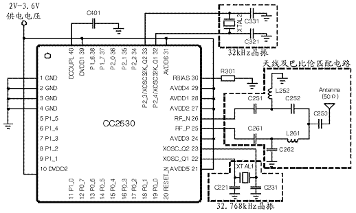 目前,常见的ZigBee 无线模块通信解决方案有两种,即ZigBee 芯片+MCU 解决方案和单芯片解决方案。为简化电路,设计中选择第二种方案。CC2530 是由TI 公司推出的第二代ZigBee 无线射频芯片,运行Zig-Bee2007 协议栈ZStack,工作电压范围为2.0~3.6 V。作为高度集成的解决方案,CC2530 集成了业界领先的RF(Radio Frequency)收发器以及增强型单周期8051 内核,内部Flash 容量可选,支持系统在线编程,传感器可通过单总线与CC2530 的I/O 端口连接,其典型应用电路如图2 所示。