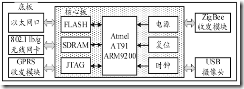 网关用于实现以太网和无线传感器网络之间协议、地址的转换和路由等功能,负责将协调器收集到的数据经以太网传输给控制中心,同时也用于将控制中心的指令发送到终端节点,工作任务繁杂,接口电路较为复杂且需要有完善的网络协议栈支持。因此,在硬件选型上采用以32 位微处理器AT91ARM9200 为核心的开发平台,设计中使用核心板(CPU+SDRAM+FLASH)加底板(外围接口电路)的硬件组成方案,要满足不同需求的应用,只需增加功能底板上的接口电路即可,如图3 所示。
