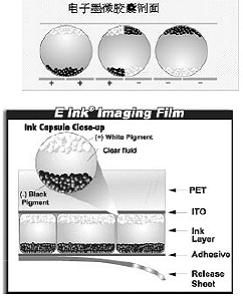 电子纸的载体是一张特殊的薄胶片,通过在胶片上“涂”上的一层带电的物质(电子墨),根据内容的不同进行后台控制,通过相应的显示组合以达到内容显示的目的。电子纸的内核就是一个广义上的IC,整个阅读器则可看作是一个薄薄的内嵌式遥控显示板。电子墨水就是将带正、负电的诸多黑白粒子,密封于微胶囊内,因施加电场的不同,在监视器表面产生不同的聚集,呈现出黑或白的效果。