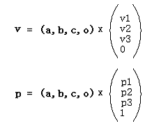 这里(a,b,c,o)是坐标基矩阵,右边的列向量分别是向量v和点p在基下的坐标。这样,向量和点在同一个基下就有了不同的表达:3D向量的第4个代数分量是0,而3D点的第4个代数分量是1。像这种这种用4个代数分量表示3D几何概念的方式是一种齐次坐标表示。