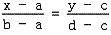 这是在图形学中普遍使用的基本技巧,我们在很多地方都会用到,比如2D位图的放大、缩小,Tweening变换,以及我们即将看到的透视投影变换等等。基本思想是:给一个x属于[a, b],找到y属于[c, d],使得x与a的距离比上ab长度所得到的比例,等于y与c的距离比上cd长度所得到的比例,用数学表达式描述很容易理解: