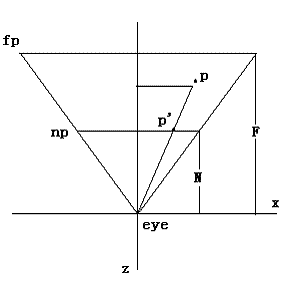 上图是右手坐标系中顶点在相机空间中的情形。设P(x,z)是经过相机变换之后的点,视锥体由eye——眼睛位置,np——近裁剪平面,fp——远裁剪平面组成。N是眼睛到近裁剪平面的距离,F是眼睛到远裁剪平面的距离。投影面可以选择任何平行于近裁剪平面的平面,这里我们选择近裁剪平面作为投影平面。设 P’(x’,z’)是投影之后的点,则有z’ = -N。通过相似三角形性质,我们有关系: