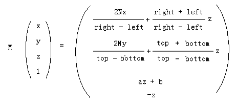 我们知道-Nx / z的有效范围是投影平面的左边界值(记为left)和右边界值(记为right),即[left, right],-Ny / z则为[bottom, top]。而现在我们想把-Nx / z属于[left, right]映射到x属于[-1, 1]中,-Ny / z属于[bottom, top]映射到y属于[-1, 1]中。你想到了什么?哈,就是我们简单的线性插值,你都已经掌握了!我们解决掉它:
