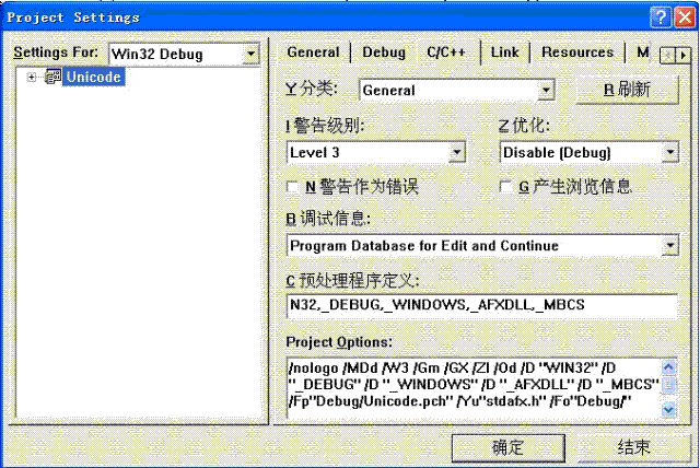 具体步骤:打开[工程]->[设置…]对话框,如图1所示,在C/C++标签对话框的“预处理程序定义”中去除_MBCS,加上_UNICODE,UNICODE。(注意中间用逗号隔开)改动后如图2: