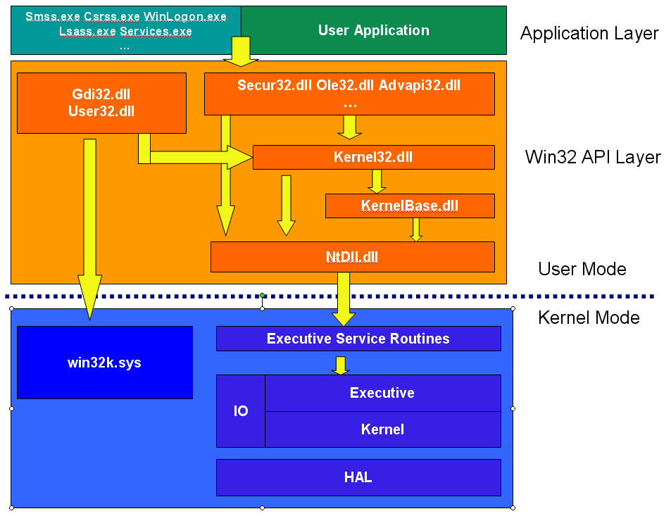 对于每层一些概念的解释,这里不详述了,具体可以参考理解Windows内核模式与用户模式.以Kernel32里的 CreateProcess 为例, 内部会调用ntdll.dll里导出的NtCreateProcess, ntdll.dll通过一个中断请求int 2Eh(Sysenter)进入内核态, 在内核的Executive Service Routines 层, 内部保存着一张表 “SSDT”(System Service Descriptor Table,系统服务描述符表), 通过该表找到该API在执行体 (Executive)(ntoskrnl.exe)中导出函数的位置,最终调用系统功能。下面是另外一张《Windows图形编程》中提到的系统架构图, 我们也可以参考一下: