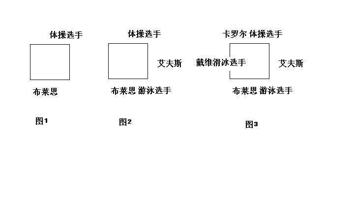 推理过程如下:从(2)可以画图1,再由(3)知道艾夫斯只能坐在布莱恩的左边或者右边,又有(1),所以爱丽丝一定坐在布莱恩的右边(如果坐在布莱恩的左边的话爱丽丝的左边则会是体操选手),且又有(1)知道布莱恩为游泳选手,即可画图2;又有4,知道女士卡罗尔必定是体操选手,所以戴维坐在布莱恩的左边,且为滑冰选手,所以知道艾里斯为网球选手