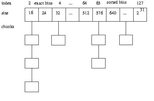 bin的英文含义是”箱柜“,当我们谈到bin,是指某个双向链表的头节点,该链表的成员节点存放着某一特定范围size的空闲chunk。通过size,我们可以快速的定位bin index,然后遍历其指向的链表,寻找合适的chunk进行分配,或者将释放的chunk插入到链表中合适的地方。